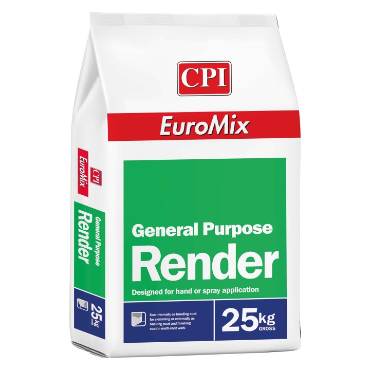 This 25kg bag of CPI EuroMix General Purpose Render is a pre-mixed blend of cement, dried sand and various high-performance additives, used for backing or finishing coats in external rendering and internal plastering. This 25kg ready-to-use, multi-purpose render is ideal for use internally as an undercoat or bonding coat with a plaster skim finish, as a backing coat for ceramic tiles, with a wood float nap finish for painting and as a dubbing out coat in renovation work. EuroMix General Purpose Render can also be used externally, as a base coat for a decorative finish or applied over expanded metal lathing or rib lath.